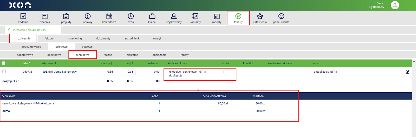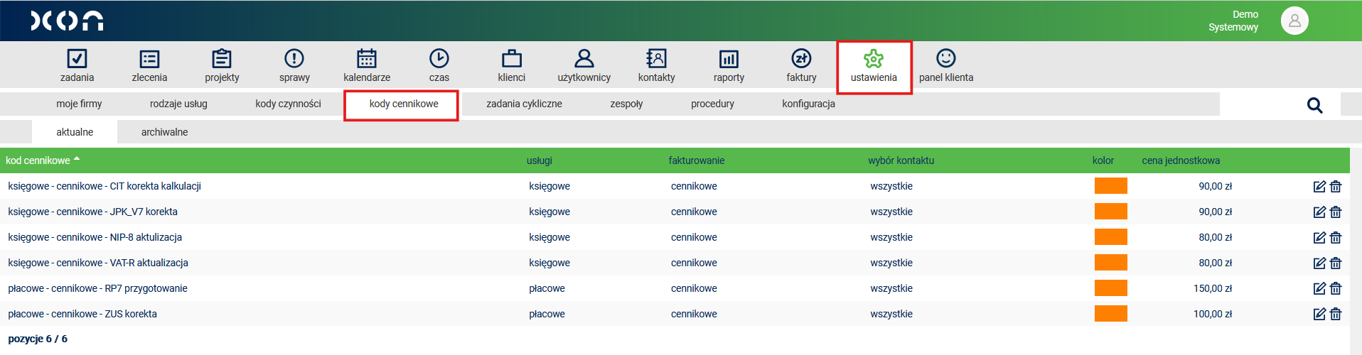 - moduł ustawienia / czas / faktury – nowy sposób rozliczeń z klientami tj. oprócz dotychczasowych rozliczeń ryczałtowych i godzinowych, dodaliśmy możliwość rozliczeń cennikowych. Cenniki za określone prace można zdefiniować w module ustawienia, w zakładce “kody cennikowe” i określić cenę jednostkową za wykonane prace.