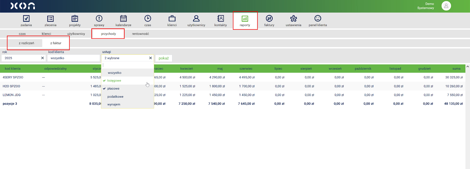 - moduł raporty – w raporcie przychodów dodaliśmy dwie zakładki „z rozliczeń” oraz „z faktur” dzięki czemu ten drugi obejmuje też przychody z faktur wystawionych ręcznie