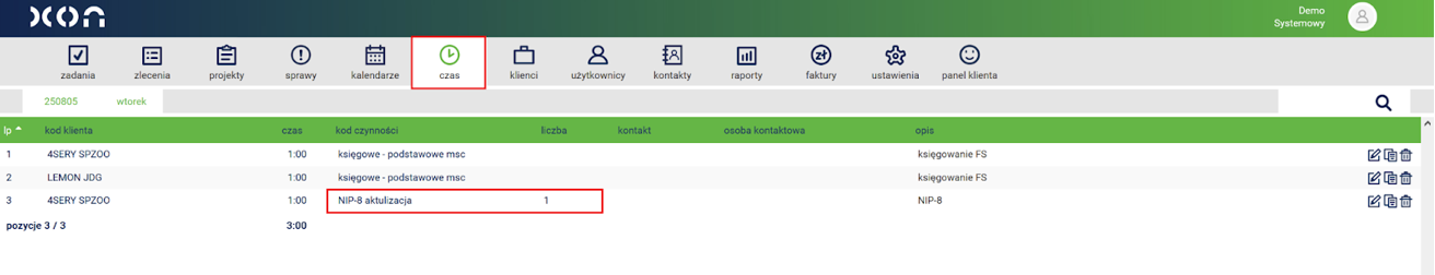 Zdefiniowane kody cennikowe pojawią się w module czas. Po wybraniu kodu cennikowego, należy wpisać liczbę wykonanych prac cennikowych.