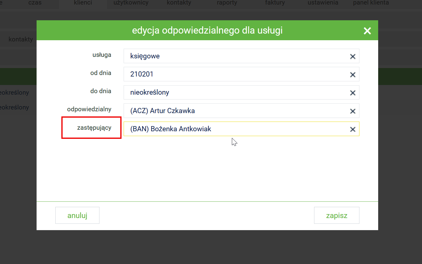 - moduł klienci – dodaliśmy możliwość ustalenia zastępującego za odpowiedzialnego dla usługi.