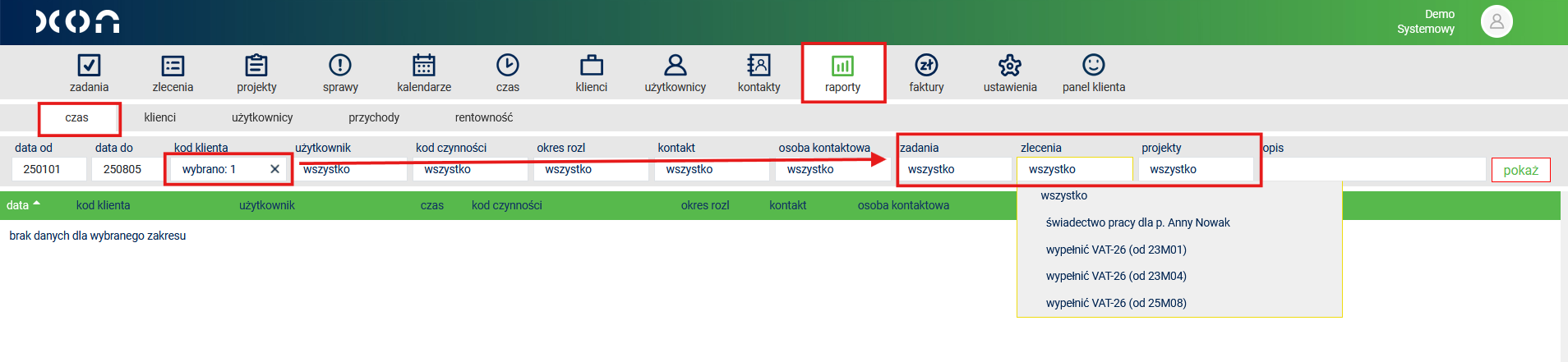 - moduł raporty – po wybraniu kodu klienta, lista wyboru dla zadań / zleceń / projektów pokazuje tylko pozycje dla wybranego klienta.