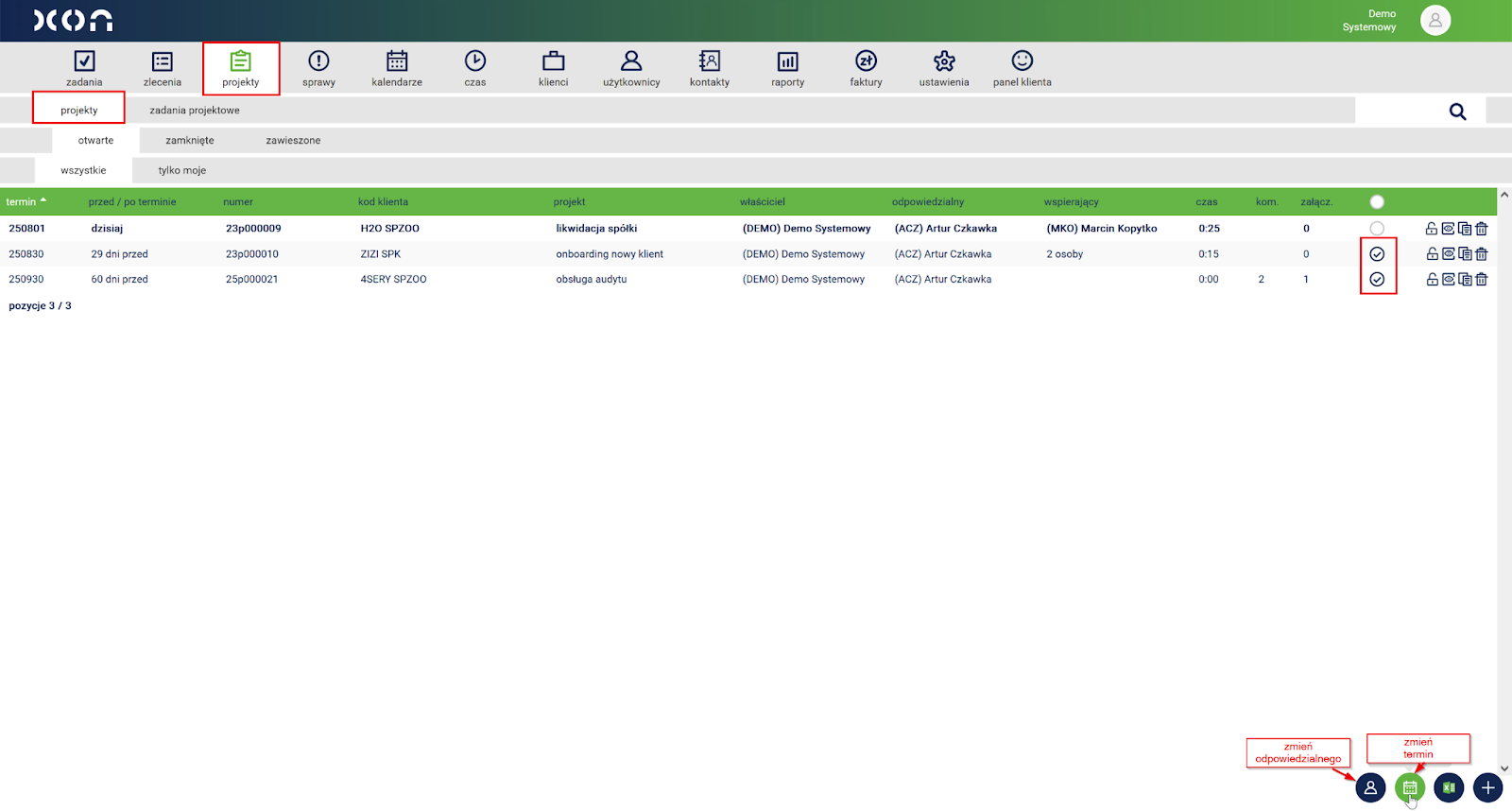 - moduł projekty – dodaliśmy możliwość zbiorczej zmiany terminu i odpowiedzialnego za projekt