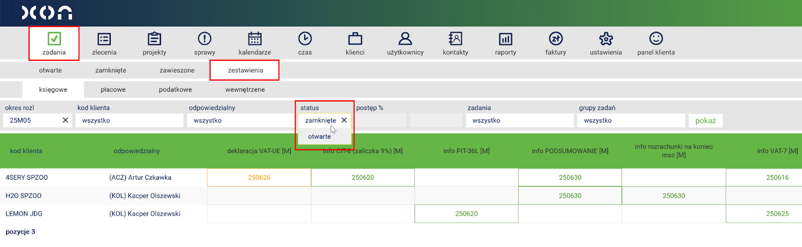 - moduł zadania – w zestawieniach dodaliśmy możliwość wyboru filtra “status”, dzięki czemu obecnie można wyświetlić tabelę dla tylko otwartych lub tylko zamkniętych zadań
