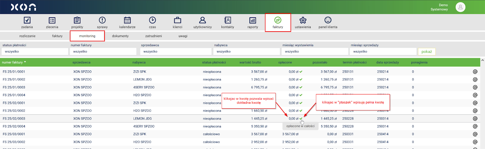 - moduł faktury – w monitoringu dodaliśmy możliwość szybkiej zmiany kwoty płatności za fakturę przyjętej od klienta