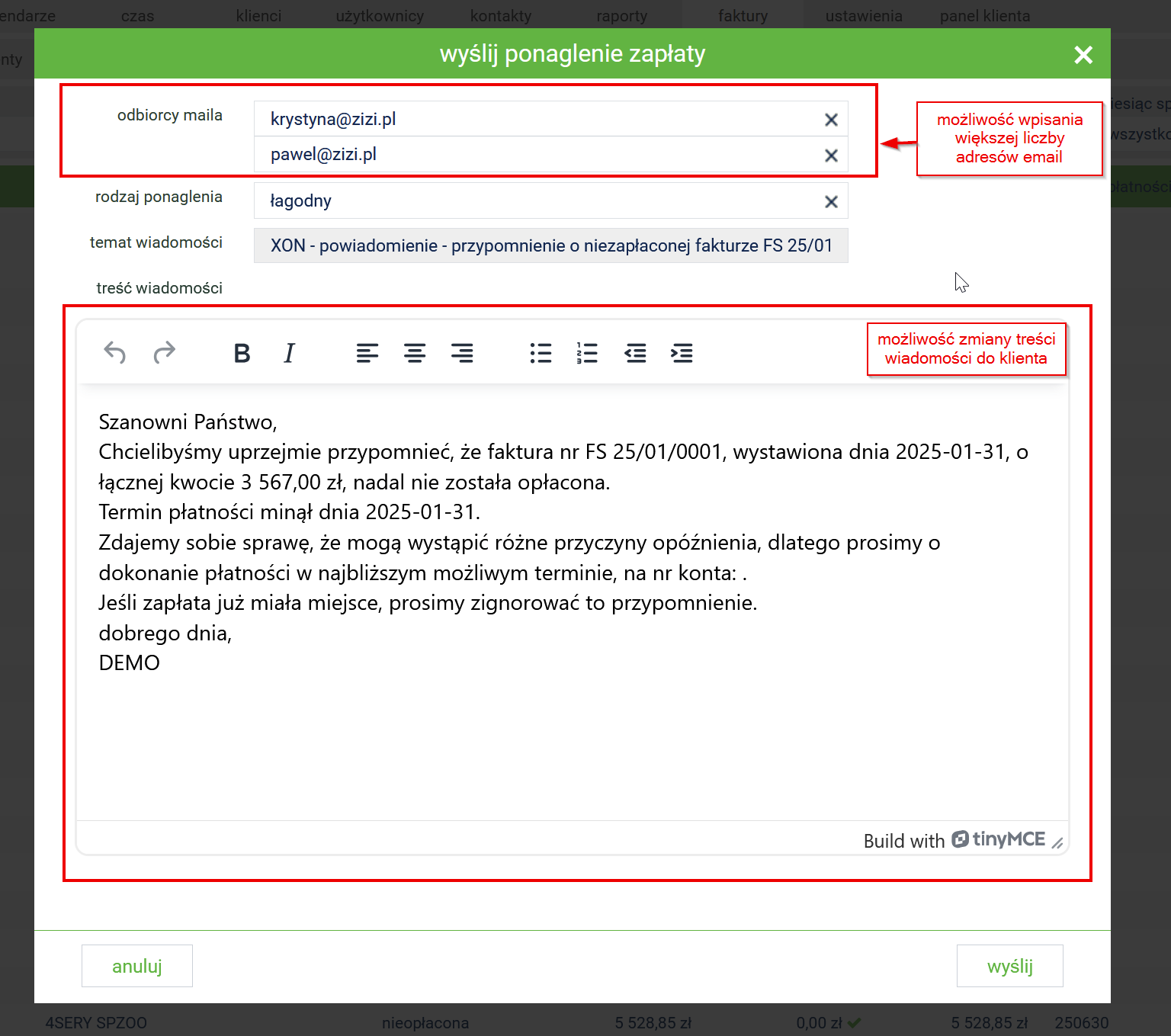 - możliwość wpisania większej liczby adresów email w celu wysłania ponaglenia,